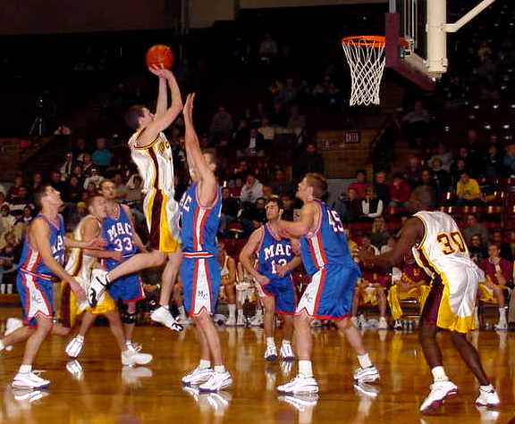 After the break Concordia cut the lead to 10 but then missed several chances at the free throw line to close the gap. For the half Concordia shot 42 percent (6-for-14) from the line. Macalester also recieved strong play from Doug Benson who finished with 16 points and 7 rebounds. Four Cobbers scored in double figures. Besides Copper's 17, Jeff Ubben (Jr., Moorhead, MN) finished with 16 and Mike Syverson (Jr., Twin Valley, MN) and Chris Thomas (So., Sioux Falls, SD) both added 10.