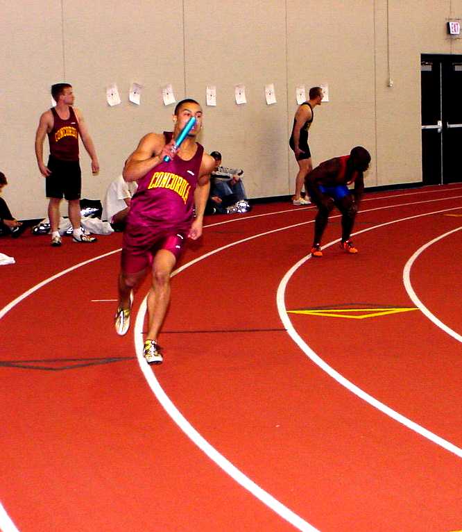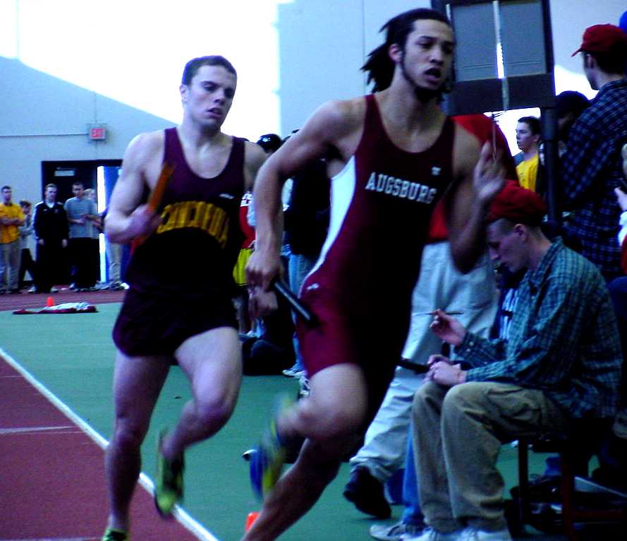 | Mike McDonald (Jr., Baxter, MN) hands off to Justin Hendricks (So., Luverne, MN) in the 4x200. | Mike McDonald looks to pass in the 4x400 |