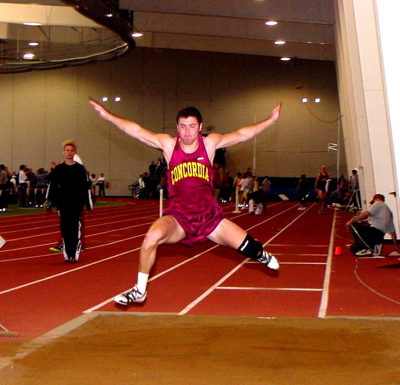 | Steve Edlund (Sr., Cyrus, MN) settles in for the 3000 | Adam Strainer (Sr., East Helena, MT) soars in the Triple Jump |