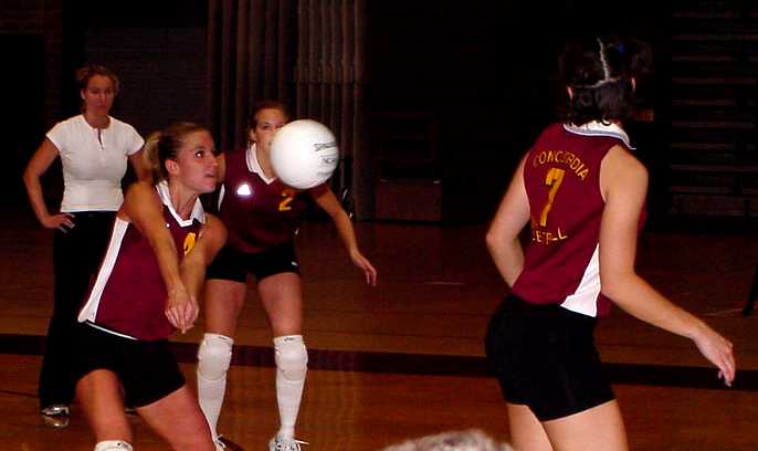 | Concordia's defense sets up for a return of service. | Andrea Dressel #5 (Fr., Maple Plain, Minn.) prepares to dig as Ayla Donlin #4 (Fr., Thief River Falls, Minn.) and Heidi Jordheim #2 (Fr., Thompson, N.Dak.) look on.. |