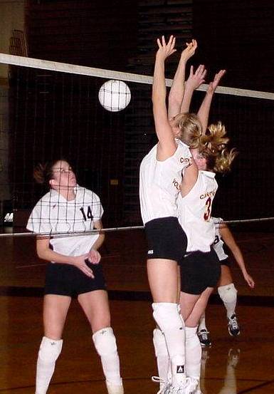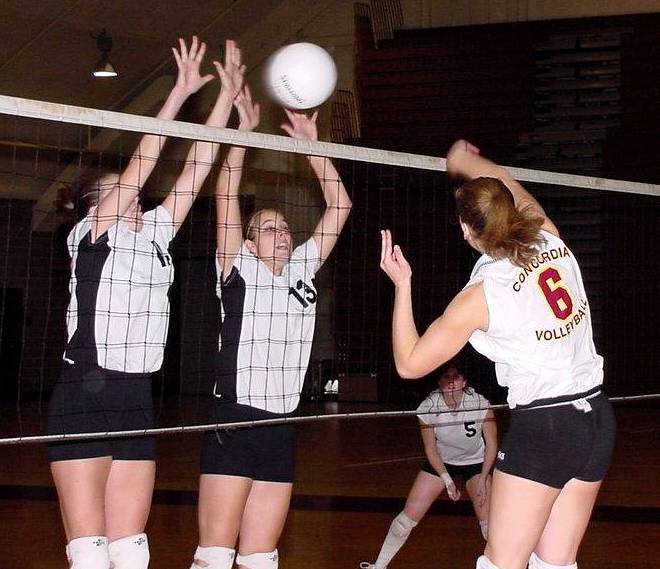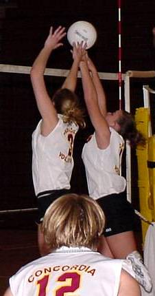 | Jessica Walden #10 (Fr., Hawley, Minn.) and Jackelyn Barten #3 (Fr., Melrose, Minn.) team up to block the ball back over to the Hamline side. | Danielle Schmiesing #6 (Fr., Villard, Minn.) sends the ball toward a pair of Hamline blockers. |