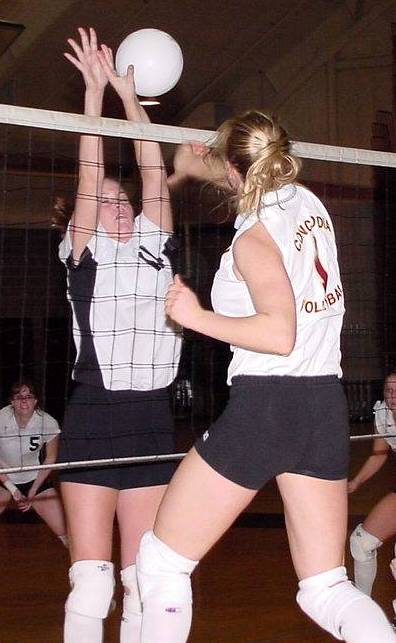 | Kris Sather #7 (Fosston, Minn.) hammers a spike past a Hamline defender. | Ayla Donlin #4 (Fr., Thief River Falls, Minn.) and Jackelyn Barten #3 (Fr., Melrose, Minn.) go up for the block. |