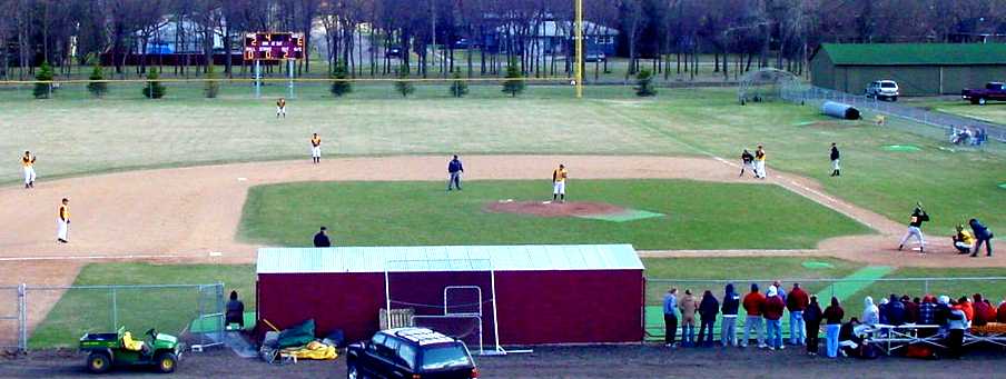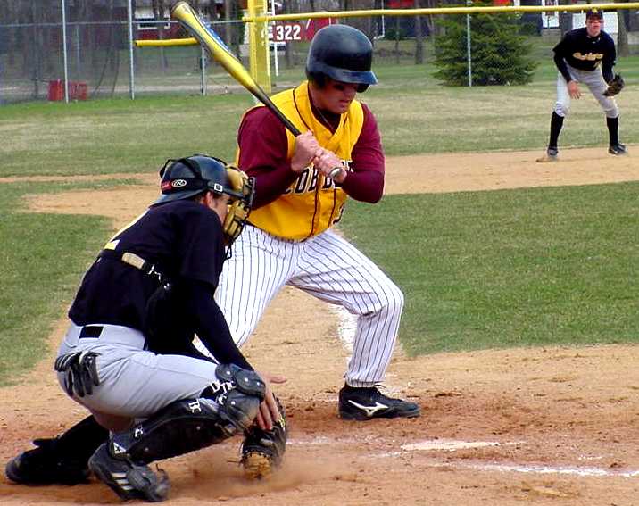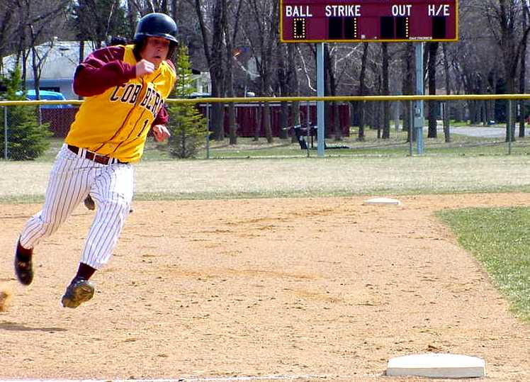 | Ben Kvidt (Jr., Detroit Lakes, Minn.) rounds third to score the Cobbers' second run in the first game of the doubleheader. | Chad Felstul (Sr., Morris, Minn.) takes a look at a low, outside pitch. |