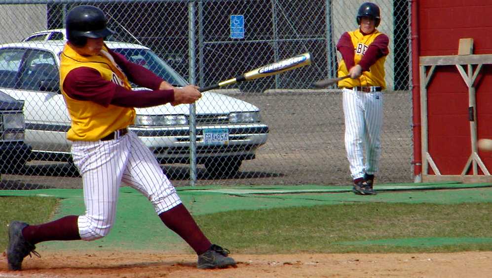 | Justin Berg (Sr., Moorhead, Minn.) hurls a pitch home in the first game of the doubleheader. | Jeremy Hinderks (So., Renville, Minn.) follows through after taking a swing in the first game. |