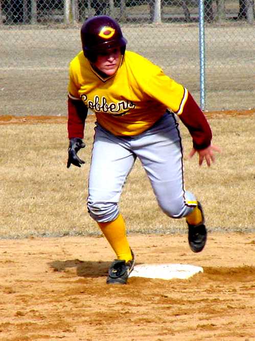 | Shyla Wilson (Jr., Cohasset, Minn.) reaches down to make contact with a pictch in game two of Concordia's doubleheader against MSU-Moorhead. | Megan Johnson (Sr., Fergus Falls, Minn.) gets a jump off second base. |