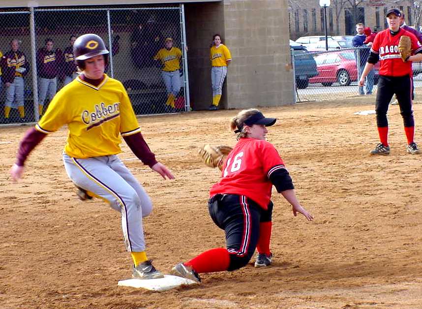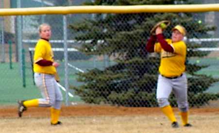 | Megan Johnson (Sr., Fergus Falls, Minn.) makes the catch and prepares to throw a runner out trying to tag from third. | Mandy Pearson (Fr., Watkins, Minn.) squeezes the ball after making the third out in the third inning of game two against the Dragons. |