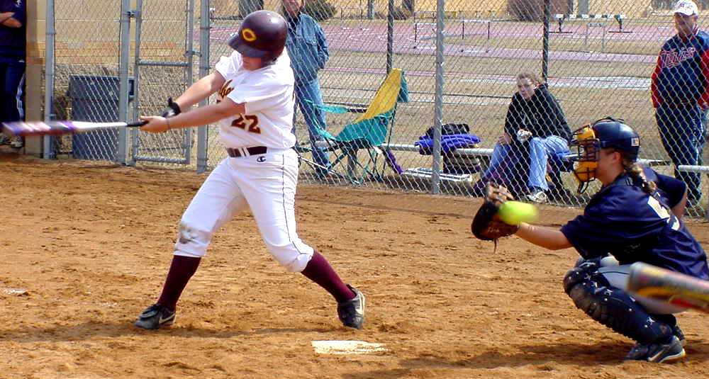 | Stacie Johnson (Jr., Belgrade, Minn.) hits a line drive back up the middle as Cobber runner (#15) Mandy Pearson (Fr., Watkins, Minn) heads for home. | Jill Pontius (Eagle bend, Minn.) concentrates as she hammers a pitch into left field. |