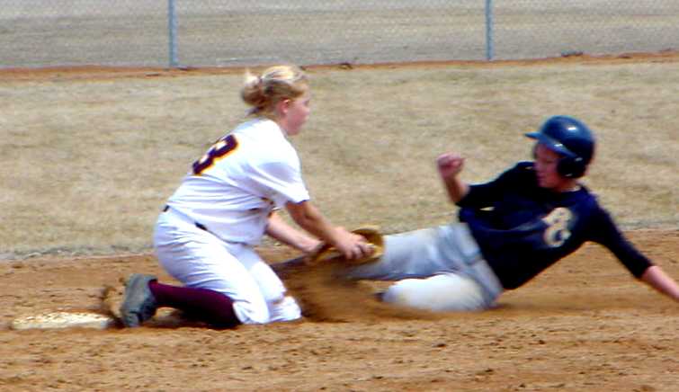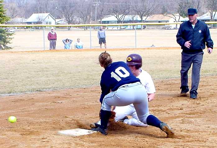 | Megan Johnson (Sr., Fergus Falls, Minn.) gets a piece of a two-strike pitch to stay alive. | Kathy Braun (Sr., Willmar, Minn.) puts the tag on a would-be Bethel base stealer. |