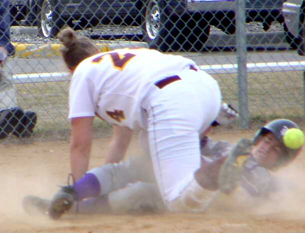 | Concordia pitcher Gretta Stritesky (Fr., Ogilvie, Minn.) tries to tag out a St. Thomas runner at home. | Leftfielder Jill Flatau (Jr., Perham, Minn.) slides to make a catch in the first game of the doubleheader. |