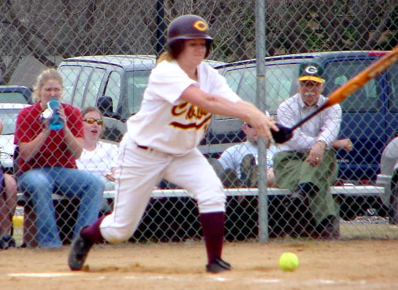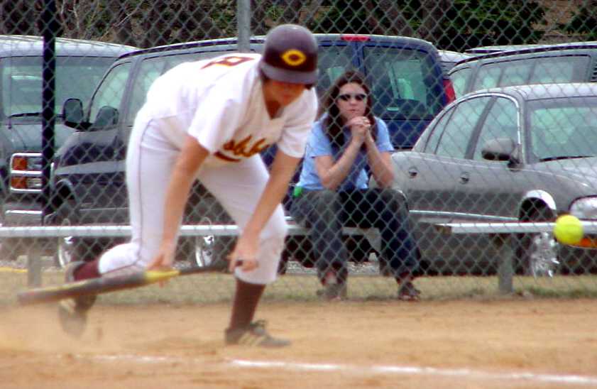 | Jolene Rebertus (Chanhassen, Minn.) lays down a successful sacrifice bunt. | Kathy Braun (Sr., Willmar, Minn.) hurries down the line to try and beat out an infield hit. |