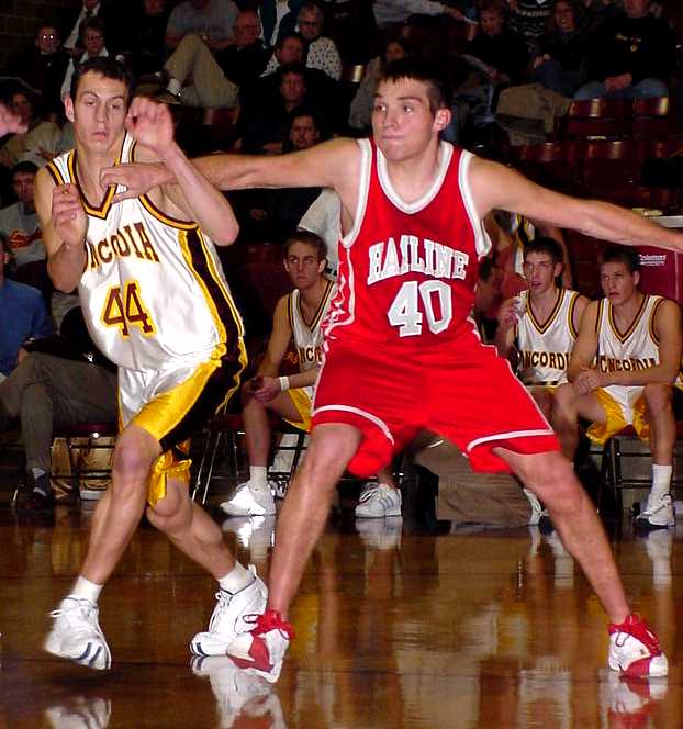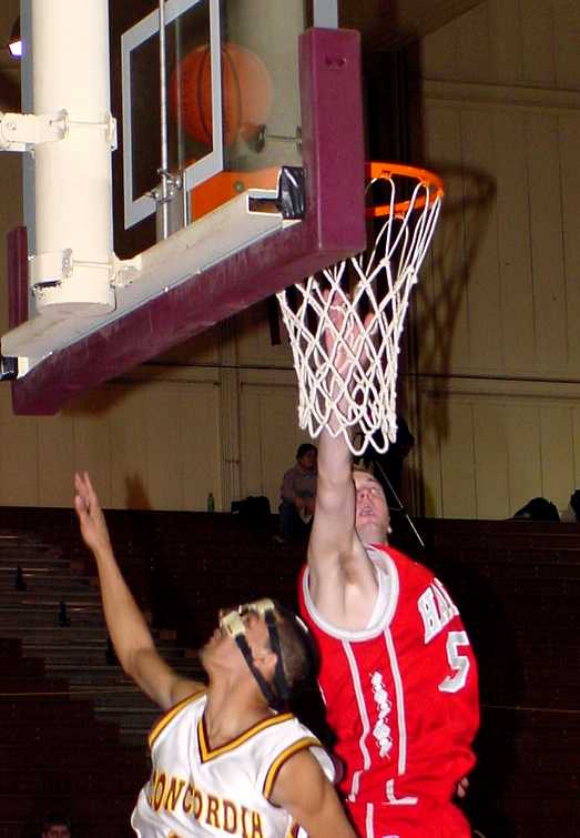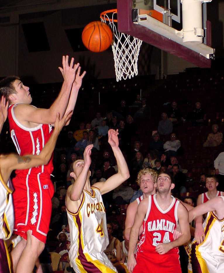 | Chris Thomas (#44, Jr., Sioux Falls, S. Dak) is one of several Cobbers trying to stop a Bethel drive to the basket. | Kevin Gilchrest (#20, So., Seattle, Wash.) lays the ball in, 0off the glass, over a Hamline defender. |