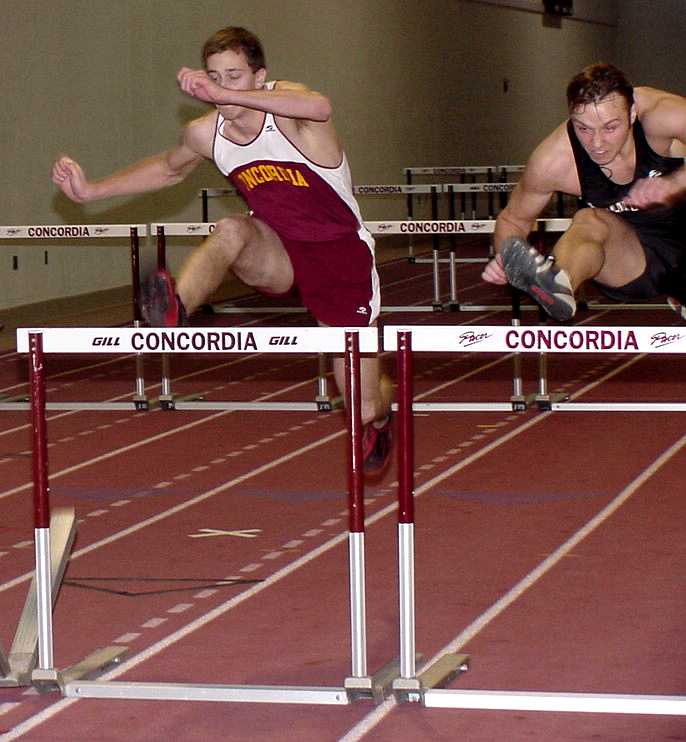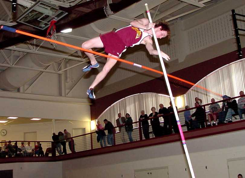 | Jeremy Pris (Jr., Somers, Mont.) approaches the last hurdle in the 55 meter hurdles. | Chris Condrad (Jr., Inver Grove Heights, Minn.) flies high in the pole vault. |