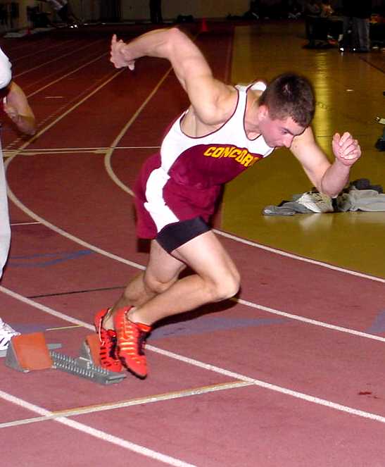 | Paul Poduska (Sr., Fort Collins, Colo.) just misses a jump at 6'7". He went on to win the high jump competition with a leap of 6'5". | Nick Steffens (Jr., Aitkin, Minn.) takes off as the gun sounds for the 200 meter dash. |