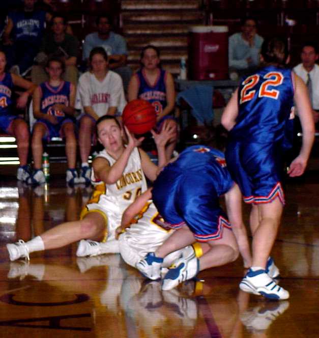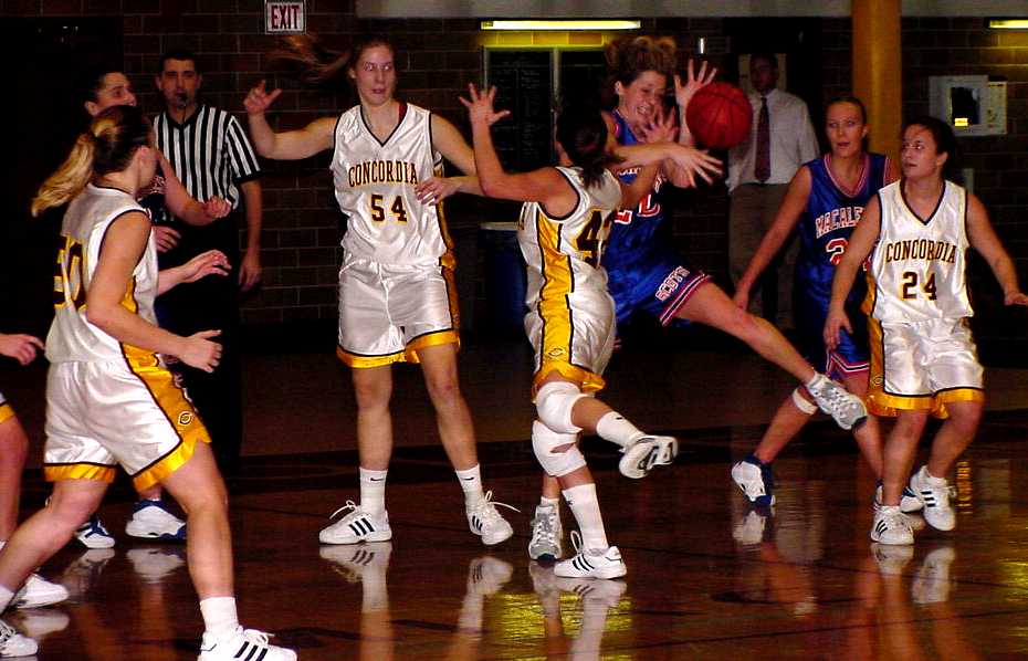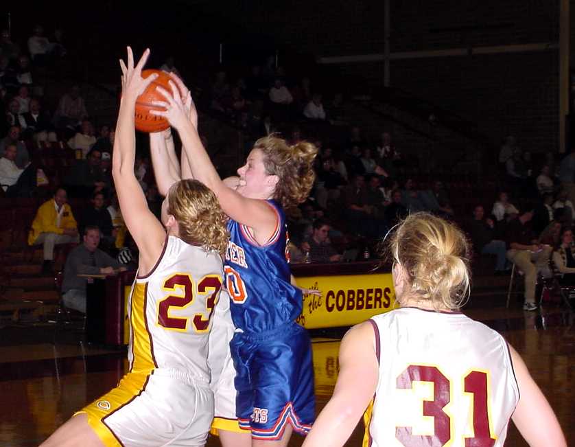 | Kasey Bostow (#50, Jr., Fargo, N.Dak.) passes the ball after going to the floor to control a loose ball. | Debbie Slack (#23 So.,Evansville, Minn.) battles a Macalester player for control of a loose ball as Mandy Berggren (#31, Sr., Cokato, Minn.) surveys the action. |