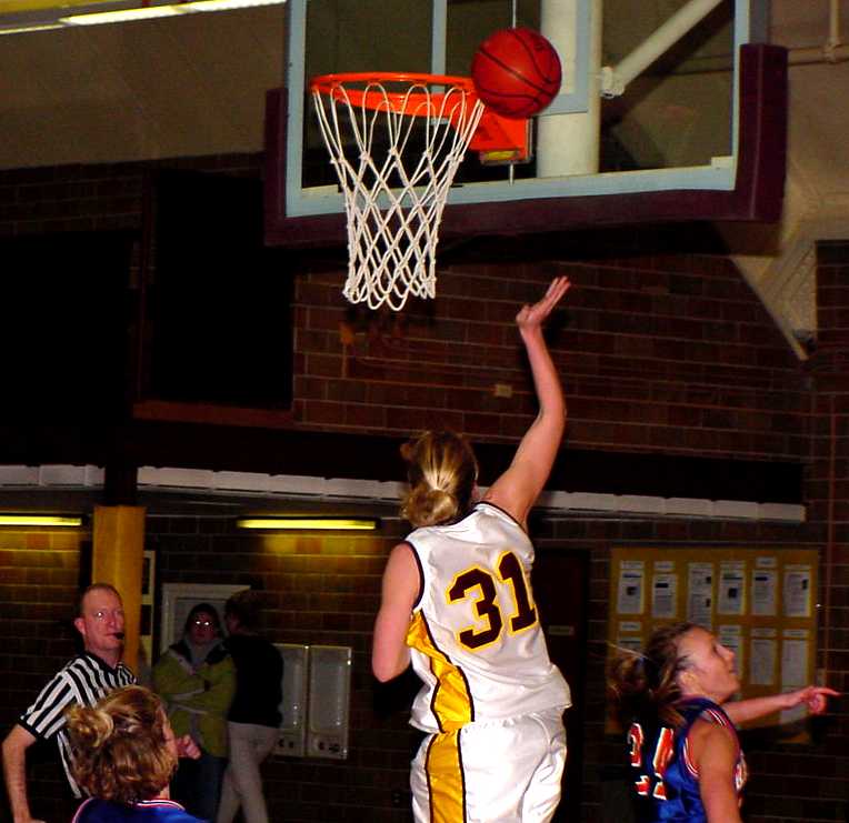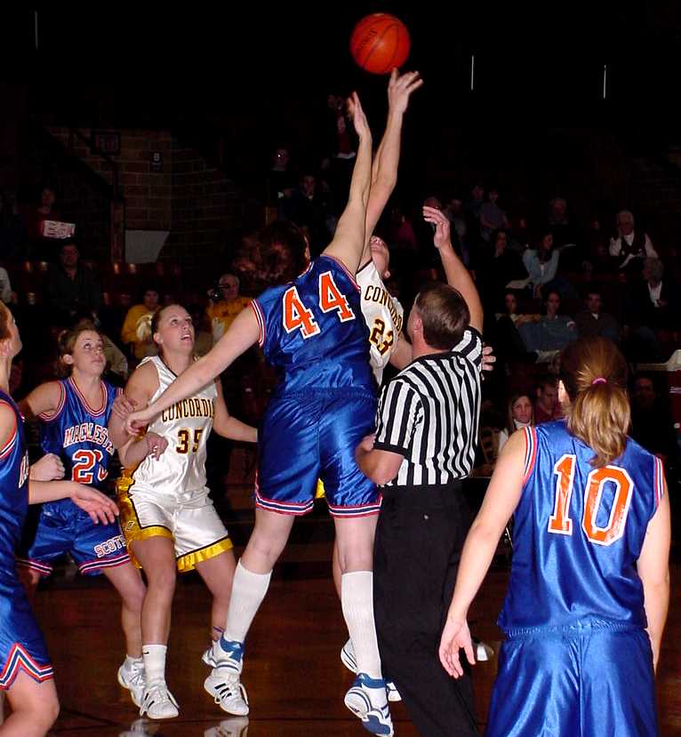 | Debbie Slack (#23 So.,Evansville, Minn.) jumps for the opening tip as Becky Fitch (#35, So., Sartell, Minn.) battles for position to come away with the ball. | Kasey Bostow (#50, Jr., Fargo, N.Dak.) puts up a tough layup in the first half against Macalester. She finished with a team-high 21 points. |