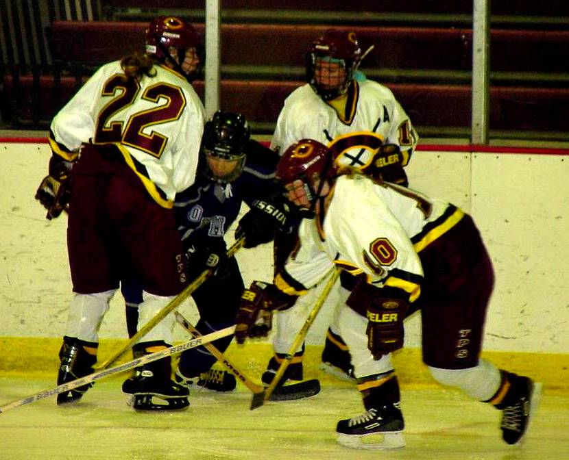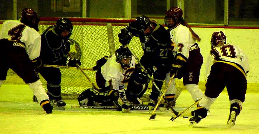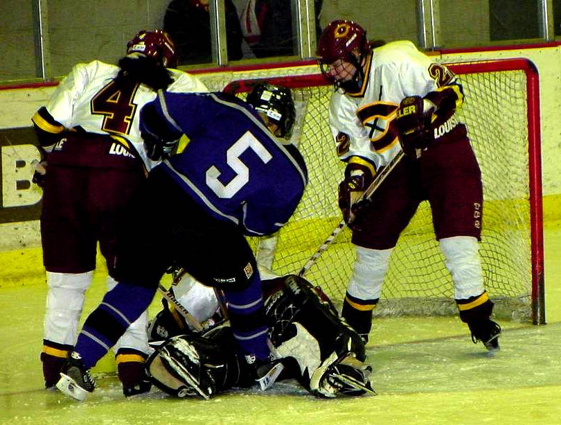 | Christine Kleven (#10, Sr., Red Lake Falls, Minn.), Lindsay Czarnecki (#22, Fr., Riverside, Calif.), and a teammate corner a St. Thomas skater and make a move for the puck. | Christine Kleven (#10, Sr., Red Lake Falls, Minn.), Lyndi Bell (#7, Fr., Victorville, Calif.), and Jenei Estrada (#4, So., Moreno Valley, Calif.) surround the net as Shyla Wilson (#1, Jr., Cohasset, Minn.) goes down to make the save. |