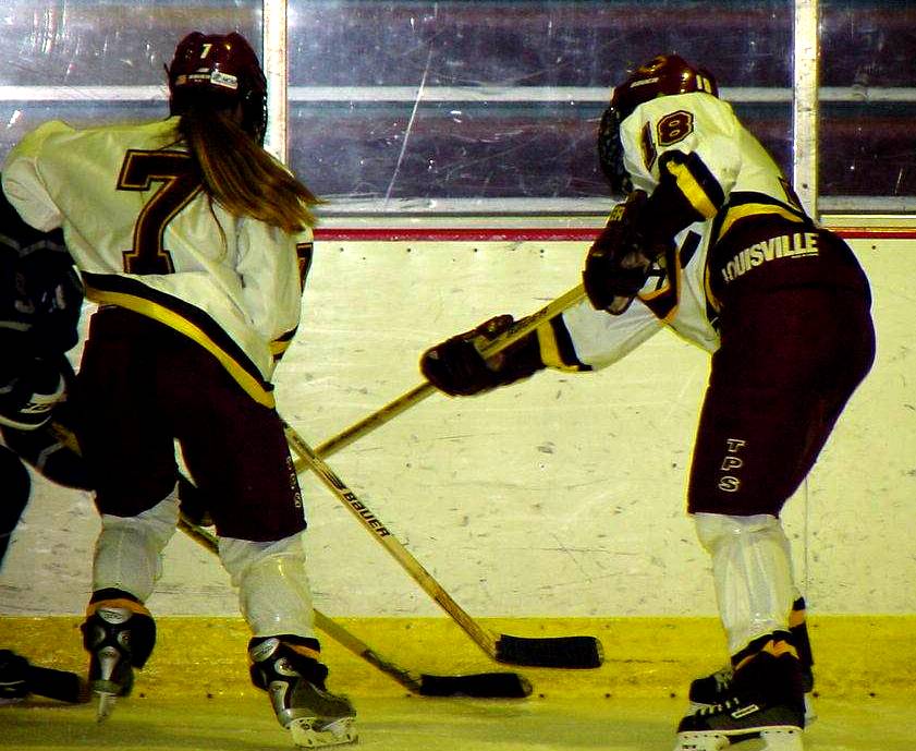 | Lindsay Czarnecki (#22, Fr., Riverside, Calif.) and Jenei Estrada (#4, So., Moreno Valley, Calif.) crash the net, but fail to notch a goal. | Lyndi Bell (#7, Fr., Victorville, Calif.) and Annie Knierim (Jr., Glasgow, Mont.) play the puck along the boards. |