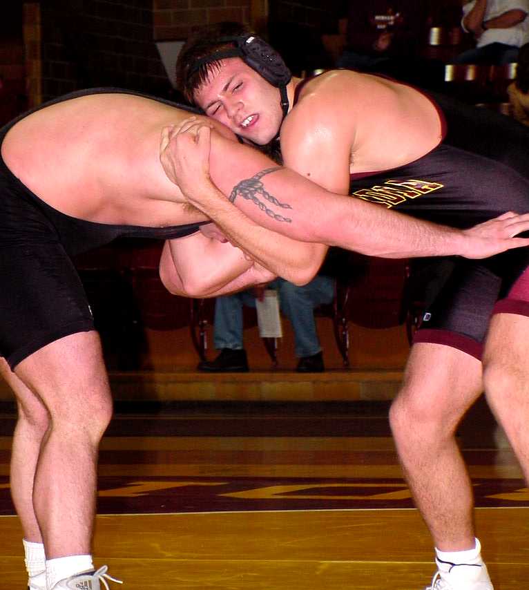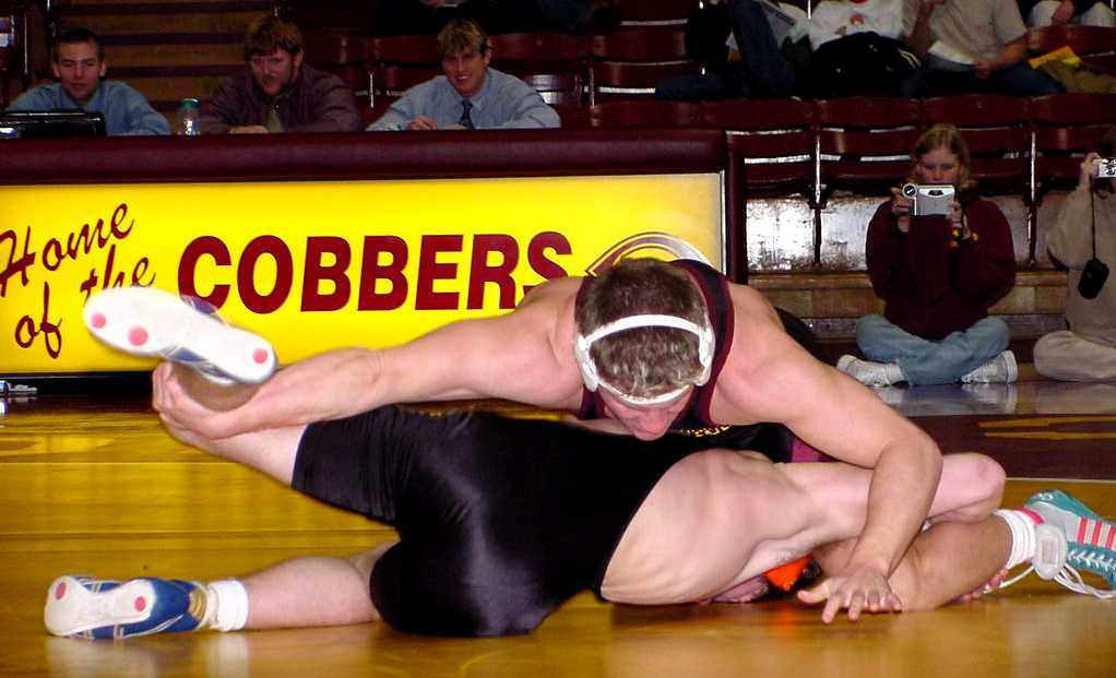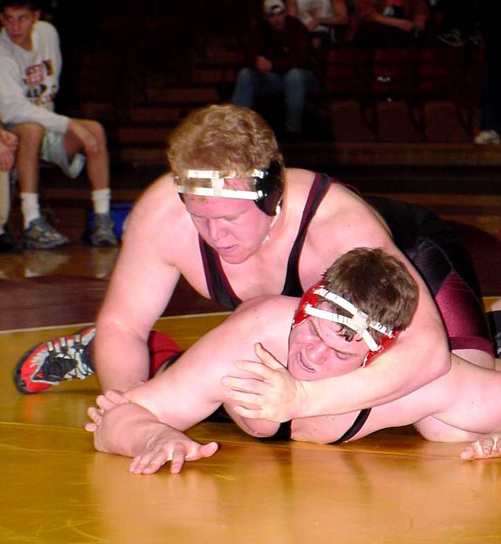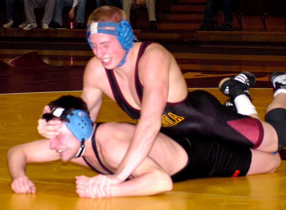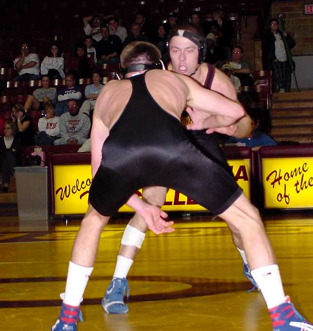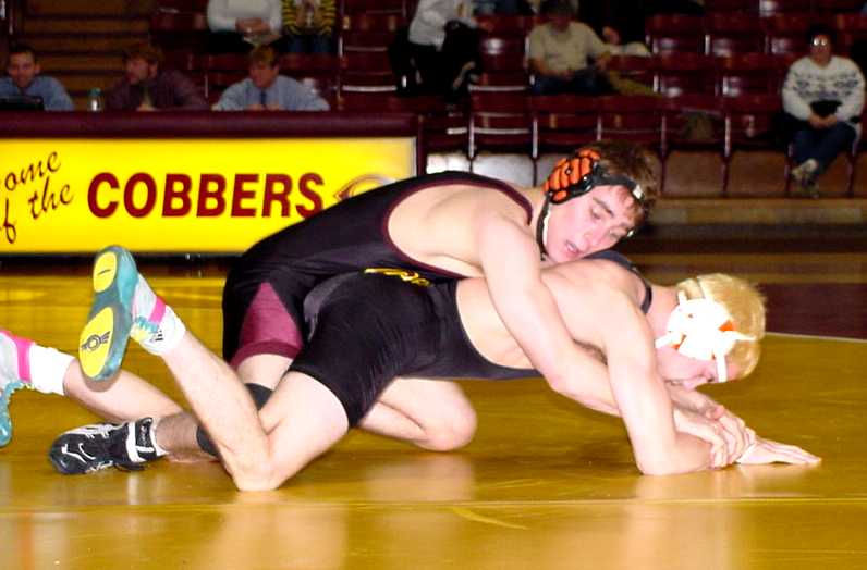 | William Duppler (Fr., Valley City, N.Dak.) dominates his opponent in the heavweight match, whic he won 6-0. | Bryce Swenson (Fr., Lowry, Minn.) searches for the right move in his 141-pound match. |