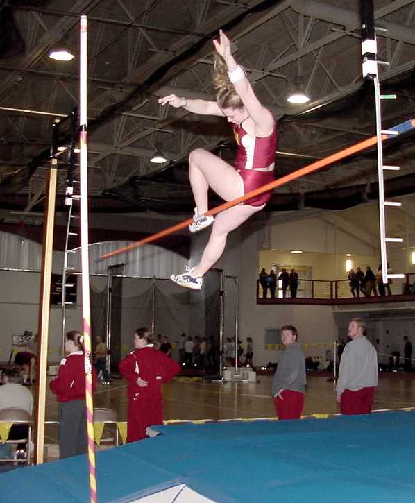 | Kristine Jensen (Fr., Pierz, Minn.) makes a landing during the long jump competition. | Renee Splichal (So., Garrison, N. Dak) just misses clearing the bar in the pole vault. |