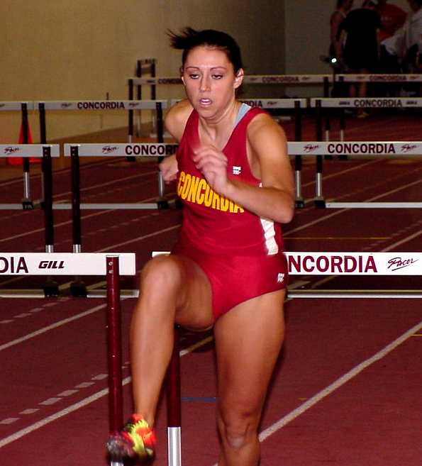 | Tarah Maatz (So., Olivia, Minn.) competes in the 55-meter hurdles. | Becky Lacher (Sr., Princeton, Minn.) prepares to release the weight in the weight throw. She finished fifth in the event. |