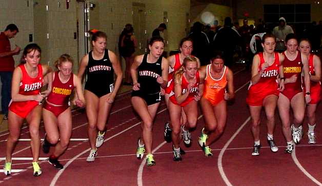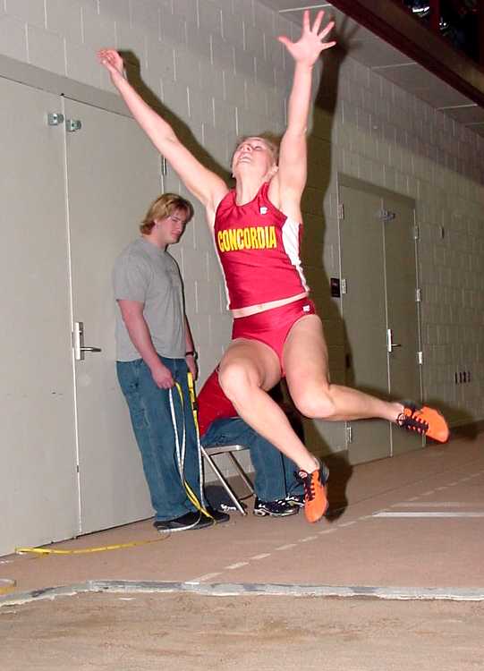 | Kelli Tranby (Sr., Moorhead, Minn.) lunges forward in the long jump, in which she took sixth place. | Julie Miller (Fr., Duluth, Minn.) and Jen Bremser (Fr., Inver Grove Heights, Minn.) are among the pack at the start of the 1500 meter run. |