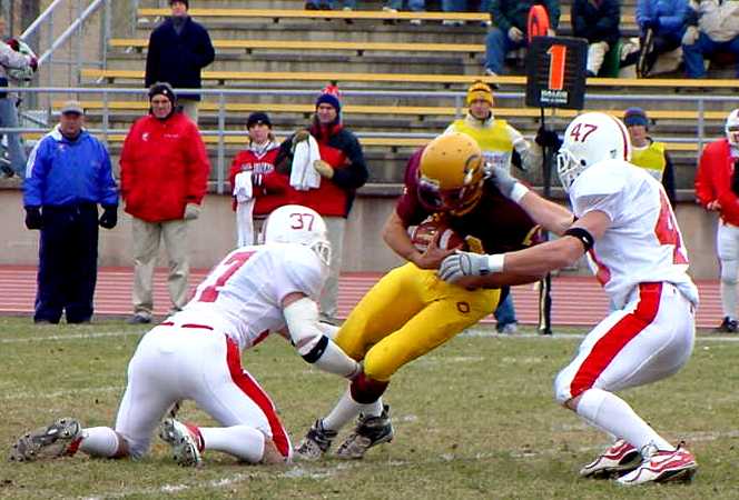 | Concordia quarterback Ryan Hebrink is wrapped up by a pair of St. John's defenders. | Johnnie wide receiver Blake Elliot tries to shakeloose of the Concordia defense. |