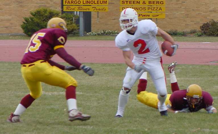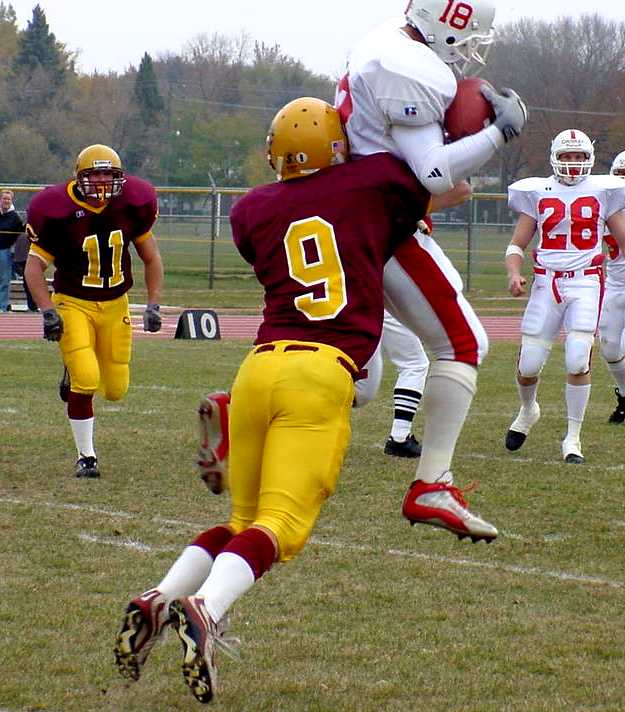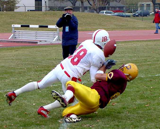 | Jordan Talge breaks up a touchdown pass intended for Lee Clintsman. | Concordia running back Jeremy Hinderks plows for short yardage. |