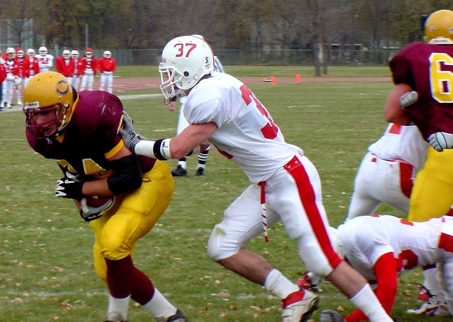 | Concordia defensive back Jordan Talge is glued to St. John's receiver Lee Clintsman. | St. John's running back Kent Crowley finds no room to run through the tough Cobber run defense. |