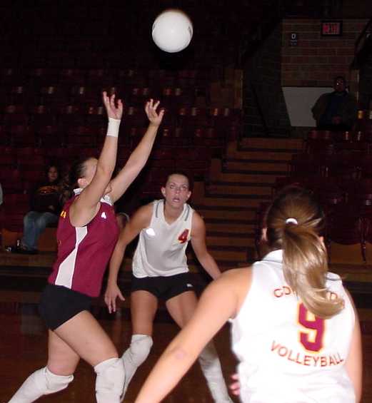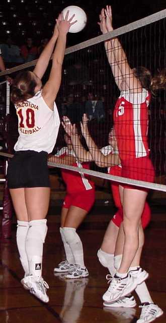 | Jackie Barten (#3 - So., Melrose, Minn.) hits the ball over the wall of St. Mary's defenders. | Jessica Walden (#10 - So., Hawley , Minn.) goes for the tip. |