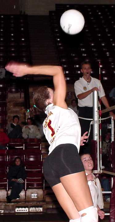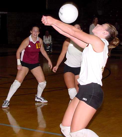 | Jessica Walden tracks down an errant pass. | Jackie Barten comes down after successfully making one of her 12 kills. |