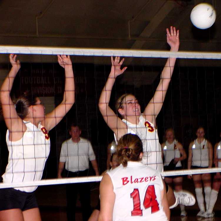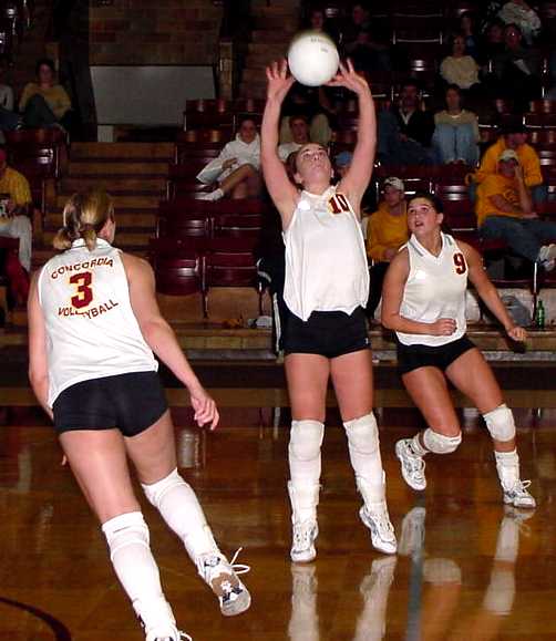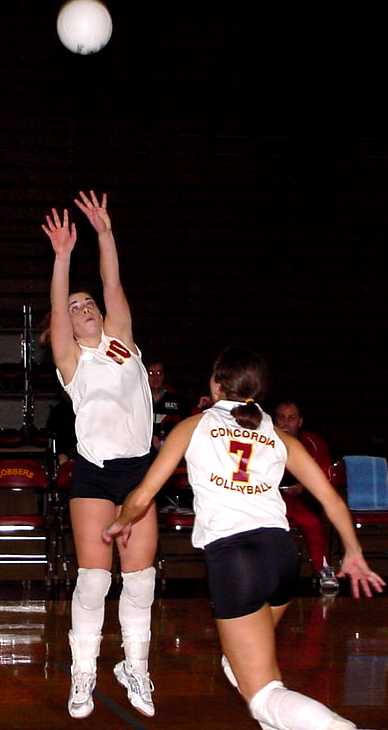 | Walden sets the ball for Kris Sather #7 (So., Fosston, Minn.). | The Cobbers are anxious for another dig. |