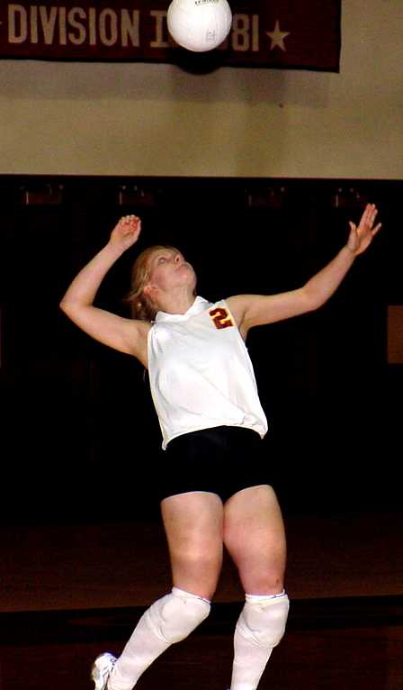| Jackie Barten # 3 (So., Melrose, Minn.) stretches for the block. | Mary Nelson (So., Moorhead, Minn.) concentrates on her serve. |