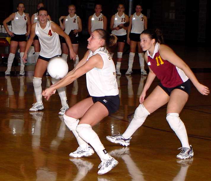 | Jessica Walden (So., Hawley, Minn.) sets up another Cobber attack. | Danielle Schmiesing (So., Villard, Minn.) prepares to dig another St. Ben's kill attempt under the watchful eye of Rhiannon Grimm (So., Hazen, N.Dak.). |