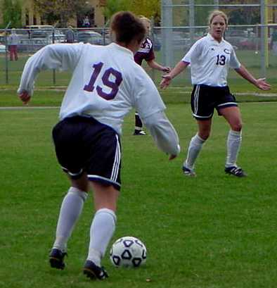 | Jessica Uecker (Fr., Duluth, Minn.) attempts to shield an Augsburg defender from the ball. | Kendra Lee #13 (Sr., Jamestown, N.Dak.) comes back to the ball for Meghan Hansen #19 (Sr., Eagan, Minn.) as she heads up field. |