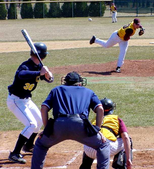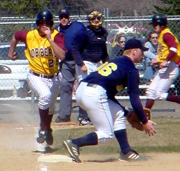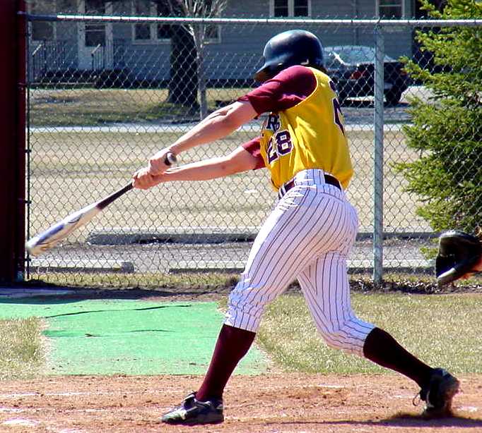 | Hinderks throws over to first baseman Ryan Hebrink to keep a Carleton runner close to the bag. | Kangas connects on a pitch in the first game. |