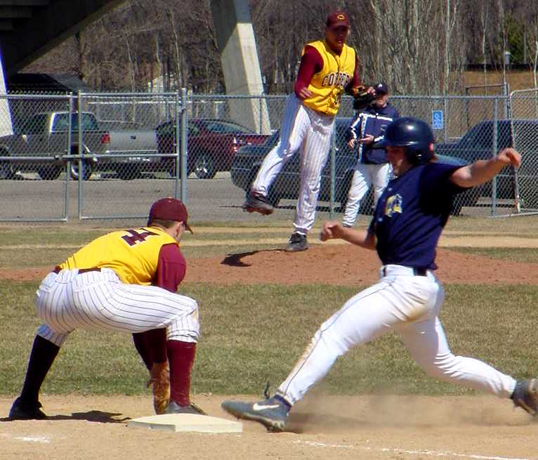 | Jeremy Hinderks delivers a pitch in game one of the Cobbers' doubleheader with Carleton. | Luther Kangas sprints towards first base to force a bad throw and help Jesse Barnacle score for the Cobbers. |