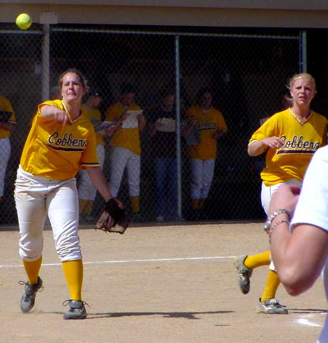 | Jamie Bang watches her slap hit roll through the infield. | Pitcher Gretta Stritesky fields a bunt and throws to first as third baseman Jolene Rebertus watches. |