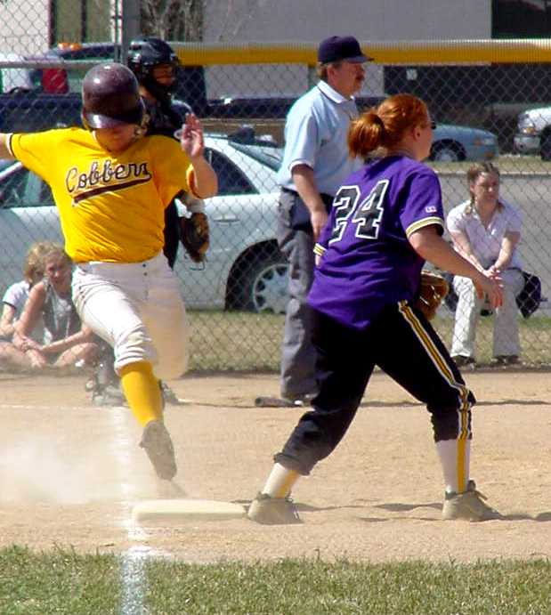 | Shyla Wilson stretches to touch first base before the throw. . | Jill Flatau squeezes the ball in her glove after catching a fly ball as Kristina Brakke comes over to back the play up. |