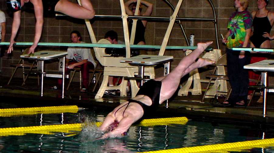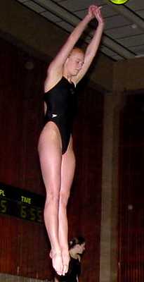 | Megan Johnson (So., So., St. Paul, Minn.) comes out of the pool on her way to winning the 200-yard butterfly. | Andrea Ross (Sr., Pleasanton, Cali.,) takes off for one of her dives during her record setting performance in the 1-meter competition. |