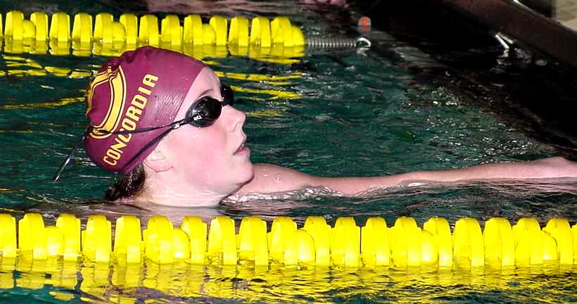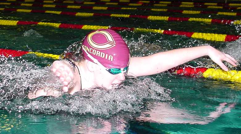 | Kaia Slevin (Fr., Roseau, Minn.) starts the 50-yard freestyle. | Jana Hemstad (Fr., Milaca, Minn.) completes the breastroke leg in the 200-yard individual medley. |