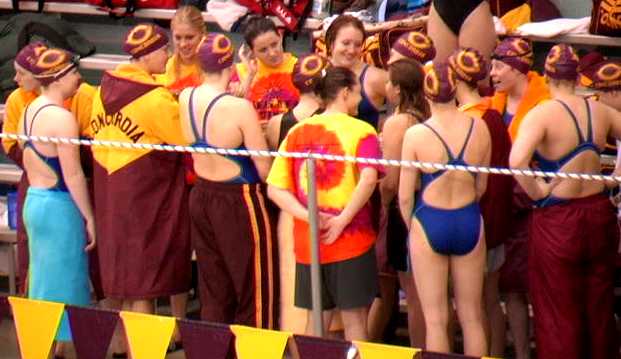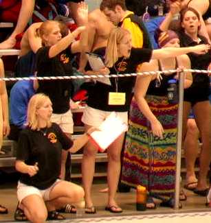 | Emily Hall #1 and Andrea Ross on the winners platfrom after their outstanding performances in the 3-meter diving competition. | The Cobber coaching staff gets into the race. |