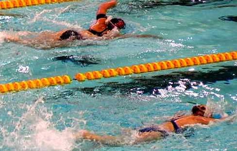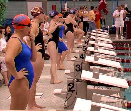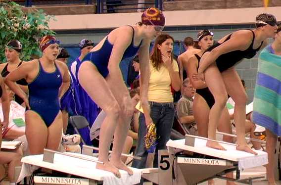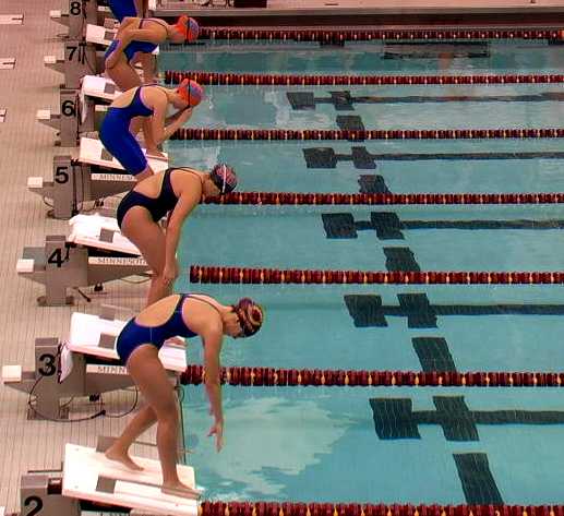 | The Cobbers have a pre-meet talk to prepare for the day's events. | Swimmers get ready to start the race. |
