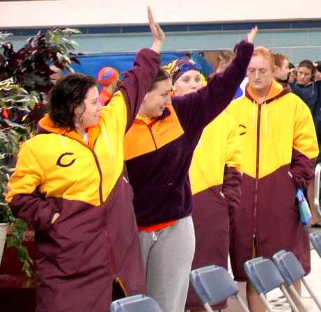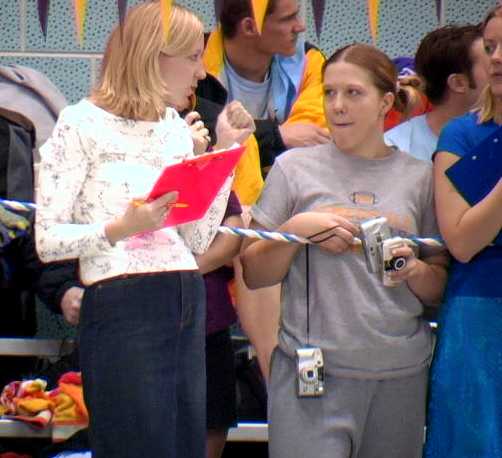 | Coach Julie Lucier explains the meaning of swimming during Saturday's finals. |