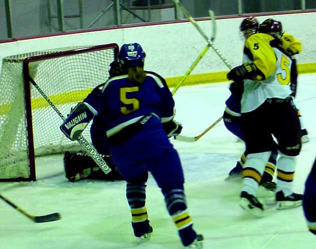 | Defenseman Jenei Estrada makes her way towards the net. | Lindsay Czarnecki fights her way past a Bethel defender. |