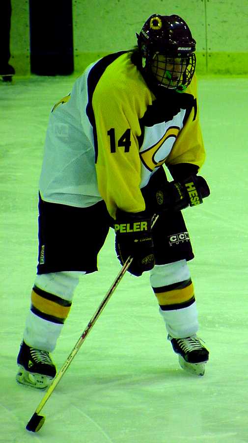 | Kali Palmer sets herself before the faceoff. | Captain Katie Jacques - she had 3 goals and an assist in the game. |