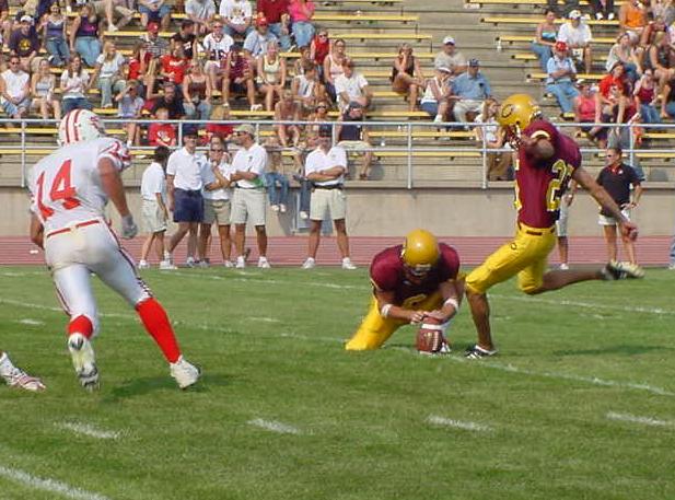 | Dragon quarterback Jon Frykman (#12) goes airborne for one of his two rushing touchdowns in the game. | Bobby Clark (#6) makes a move to the outside for a few of his team-high 118 rushing yards in the game. |