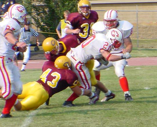 | Cobber linebacker Josh Dietz (#43) wraps up Dragon runningback Cody Wang (#20). | Cobber cornerback Josh Vickerman (#4) breaks up a pass at the Dragon goalline. |