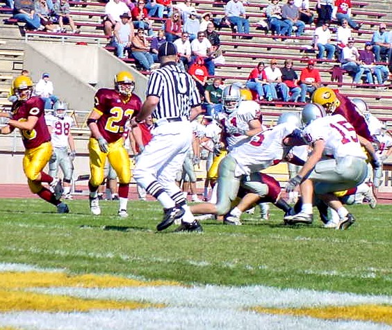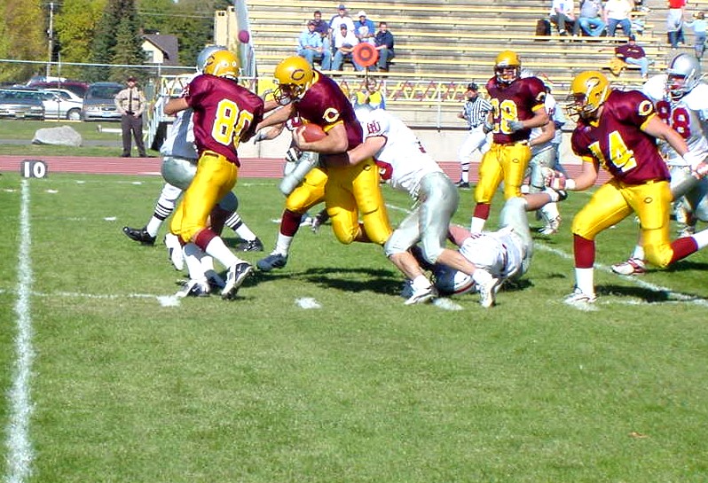 | A Cobber ballcarrier drags Hamline defenders towards the goalline. | The Cobbers drive for a score. |