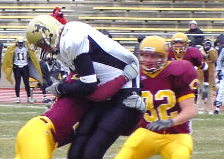 | The Cobber defense puts the hammer down on a St. Olaf receiver. | Josh Vickerman pressures the St. Olaf punter. |