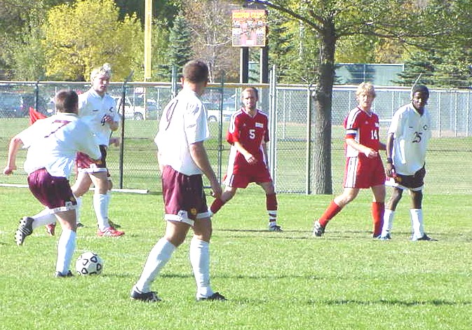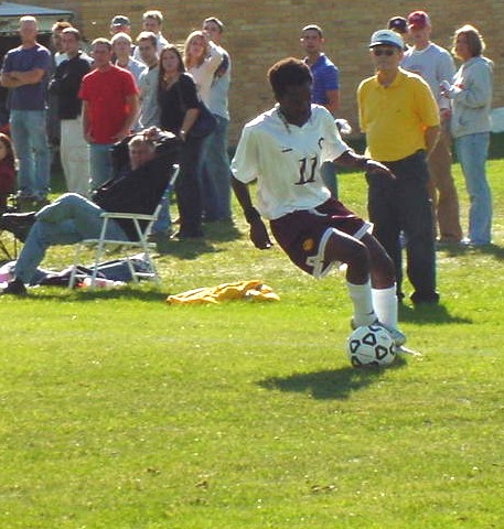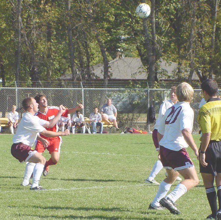 | Jerry Nathan (Fargo, N.Dak.) waits for the ball to come down. | VanValkenburg congratulates Nwachukwu Chukwualoa (Lagos, Nigeria). Chukwualoa put pressure on the St. Mary's goaltender which caused Concordia's second goal of the game. |